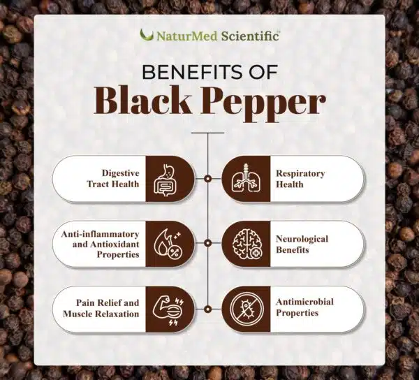 - The 2015 study titled “Potential of Black Pepper as a Functional Food for Treatment of Airway Disorders“, published in the Journal of Functional Foods, explored black pepper’s bronchodilatory properties. It demonstrated that black pepper and its active component, piperine, alleviate airway constriction through dual inhibition of phosphodiesterase enzyme and calcium influx, supporting its potential as a nutraceutical for respiratory conditions like asthma and bronchitis.
